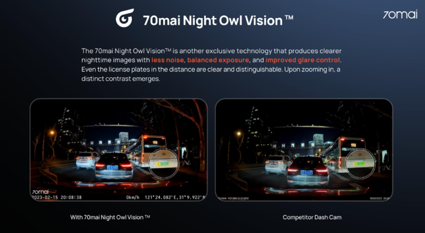 Công nghệ 70mai Night Owl VisionTM là một công nghệ độc quyền khác tạo ra hình ảnh ban đêm rõ nét hơn với ít nhiễu hơn